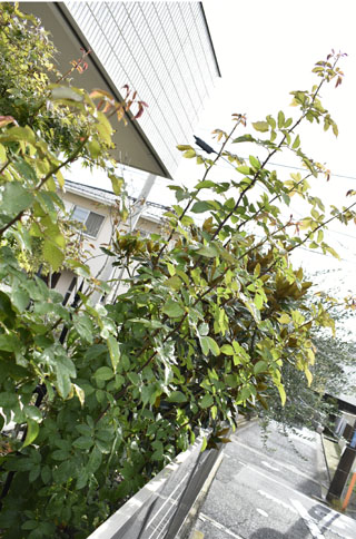 塀からはみ出して、横のタイサンボク・リトルジェムより背が高くなっている。(道路から撮影)