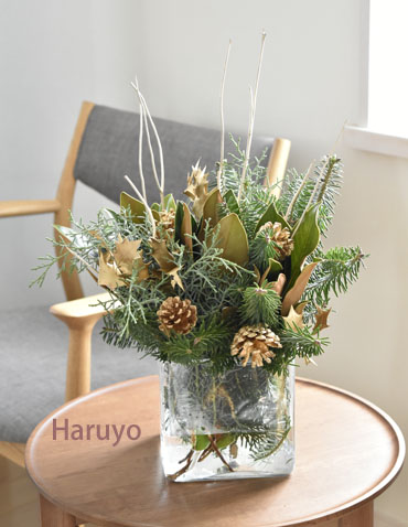 クリスマスリースと同じ雰囲気でアレンジ。 今年の我が家のクリスマスのテーマはグリーン+ちょこっとゴールドです。