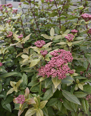 庭のガマズミ(ビバーナム・ティヌス)の濃いモーヴの固いつぼみがちょっとふくらんできました。