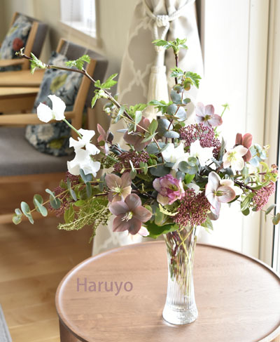 庭のビバーナム・ティヌスとクリスマスローズ(マエストロ)をガラス器にアレンジしました。