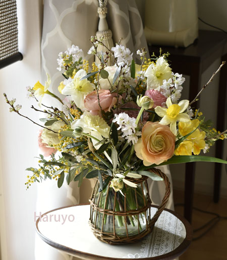arrangement 26.03.16. 早春の花束*桜、スイセン、ラナンキュラス、ミモザなど hanaringo 2026年3月16日 肌寒い日もありますが、日差しは温かくなってきました。 ソメイヨシノの開花も、もうすぐ。 久しぶりに春の花で花束を組んでみました。 早春の花束 桜を中心に、春の球根植物(ラッパスイセン、ラナンキュラス、フリージア)、ミモザ、バラなど。