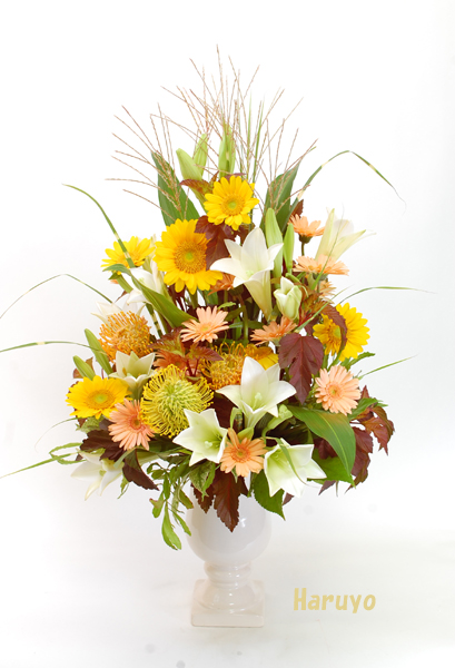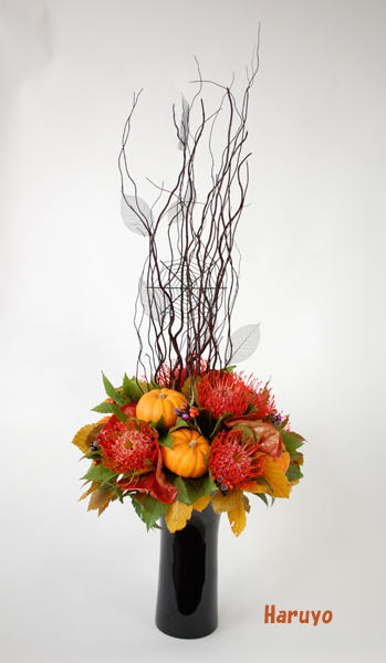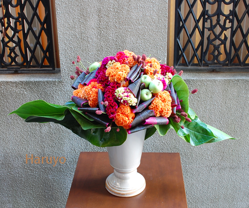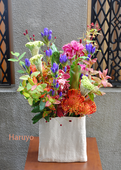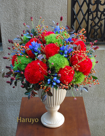 秋のアレンジメント*ケイトウ、テマリソウ、リンドウ 2013