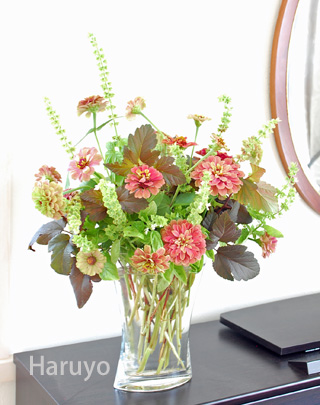庭のジニア(クイーンズレッドライム)、穂が出てしまったバジル、それに、ディアボロをざっくりガラス器に。