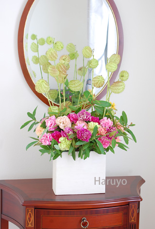 カラフルなカーネーション、フウセントウワタを使ったパラレルスタイル。