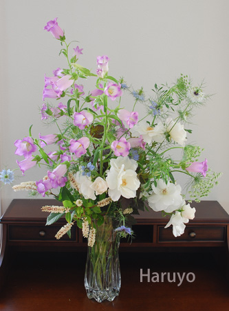 初夏の庭のカンパニュラ(ツリガネソウ)、ニゲラ、コバノズイナ、バラ(アイスバーグ)をカジュアルに、軽やかにアレンジ。赤銅色のディアボロで引き締めて。