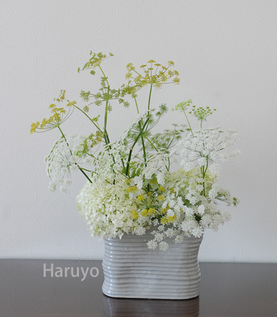 庭のアメリカアジサイ・アナベル、ホワイトレースフラワー、フェンネルの花をアレンジに。イメージは、レースのカーテン!?