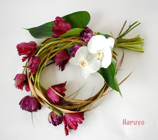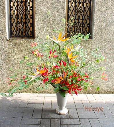 ストレリチア、グロリオーサで色をたして、レモンリーフで根元を引き締めます。