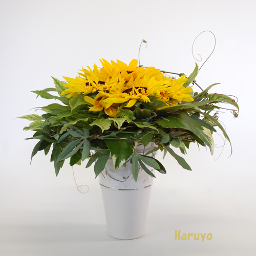 ヒマワリに庭のトケイソウとヤツデでダイナミックにアレンジ。