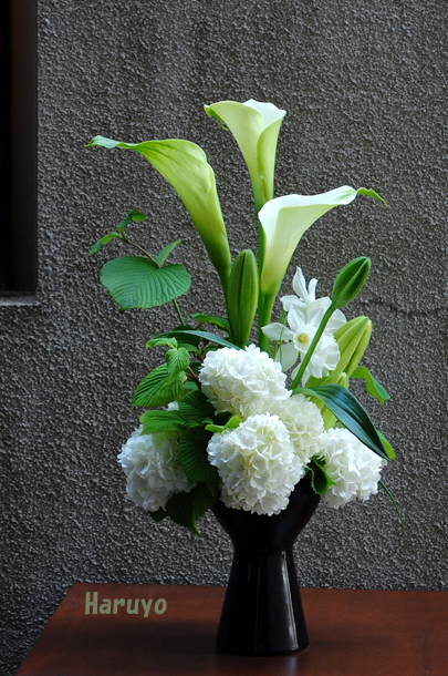 庭のオオデマリ、白いラッパスイセン、カラー(グリーンゴッデス)、スカシユリで。
