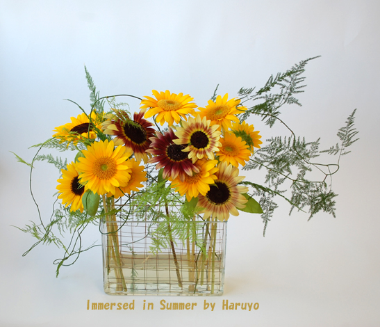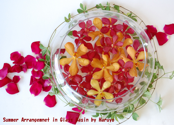 ガラスの水盤にモカラを浮かべて、涼しげな夏の花あしらいを。