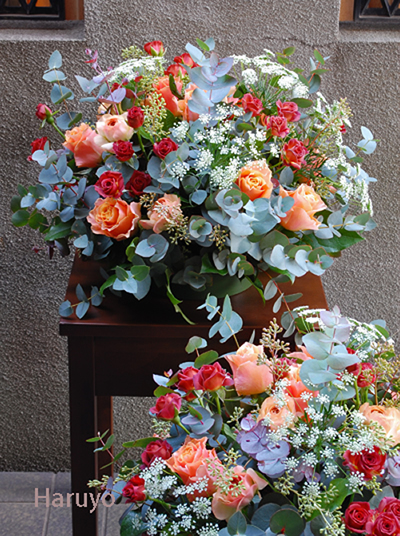 濃いサーモンピンクのバラ(ランハーツ)と、ピンク~オレンジのラナンキュラス、ガマズミなどでふんわりアレンジ。