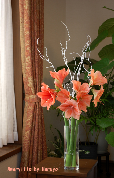 アマリリスのつぼみが開く度、ぱっとお部屋が明るくなります。